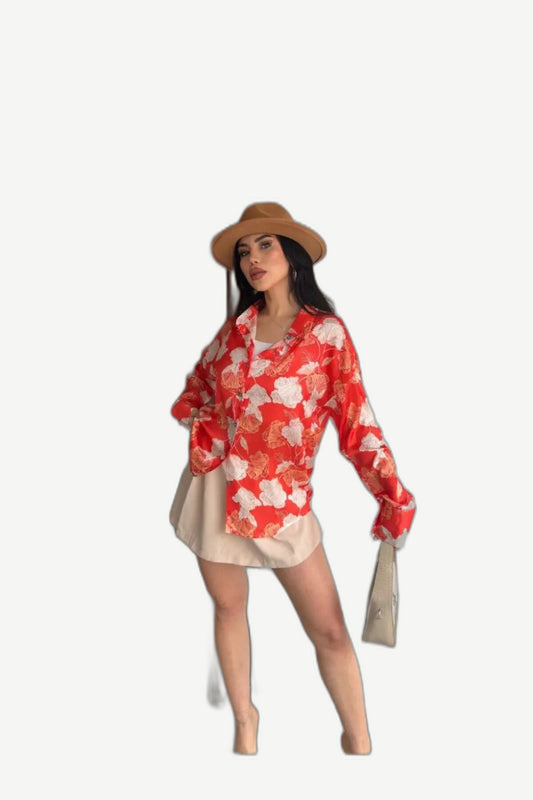 Rosstef Cool & Sexy Kadın Kırmızı Çiçek Desenli Saten Gömlek