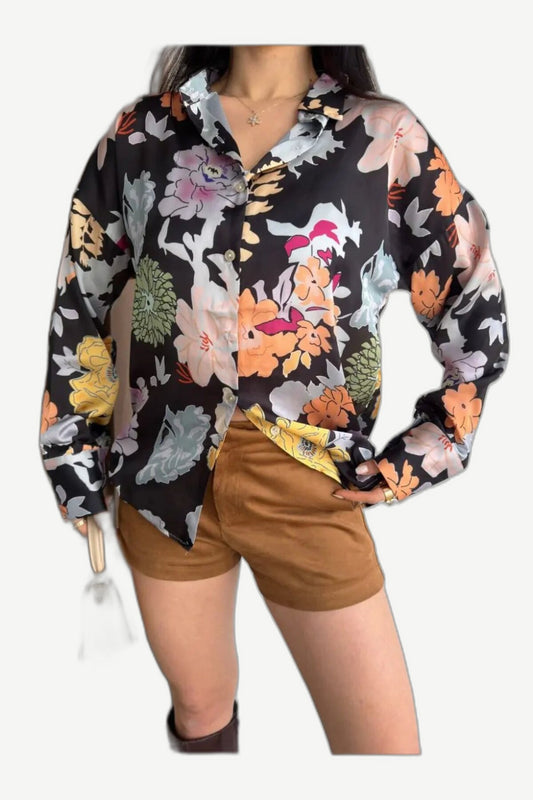 Rosstef - Cool & Sexy Kadın Renkli Çiçek Desenli Saten Gömlek