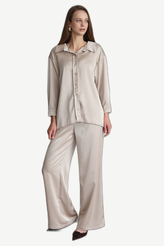 Trend Alaçatı Stili Taş Düğmeli Oversize Saten Gömlek ve Pantolon Takım
